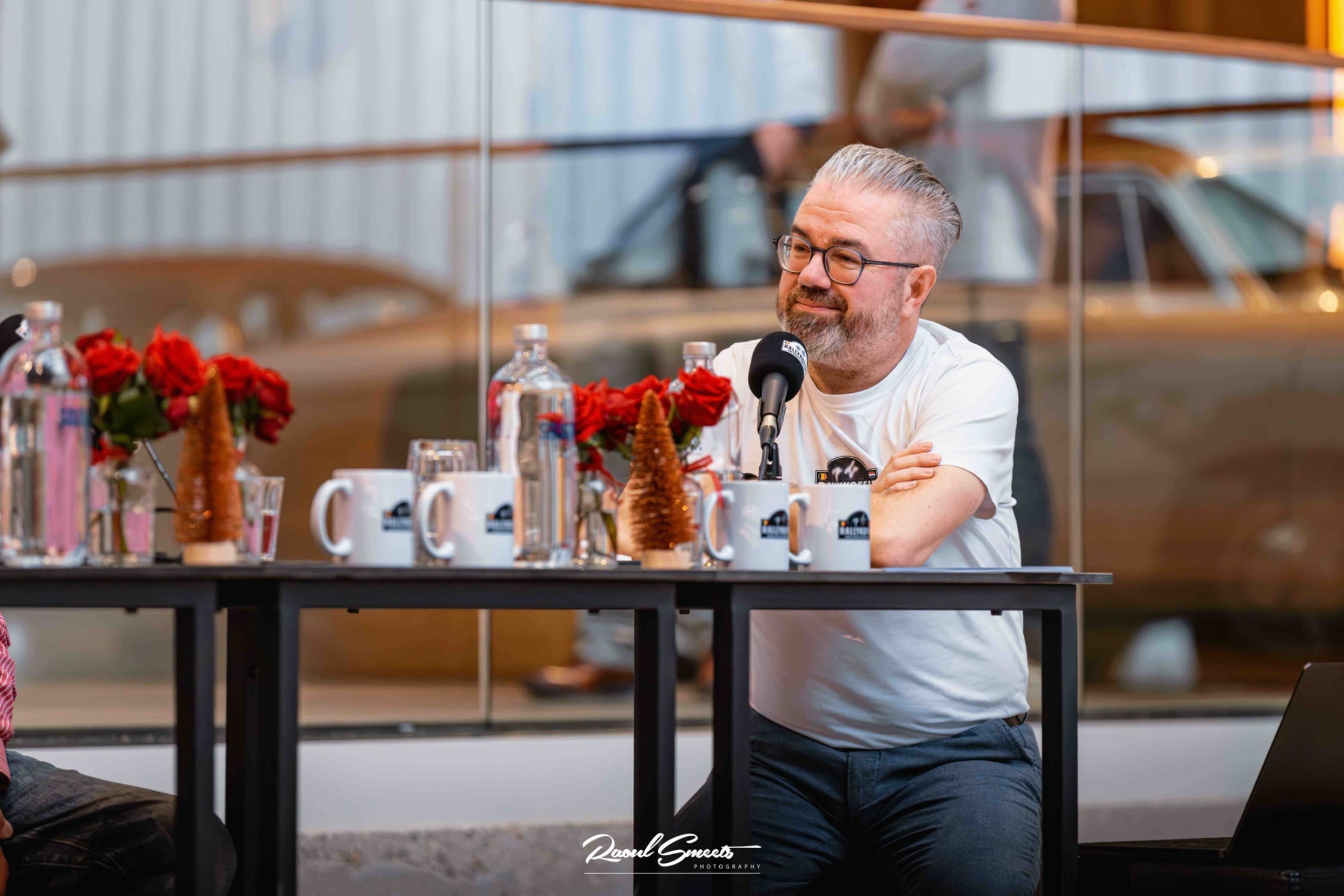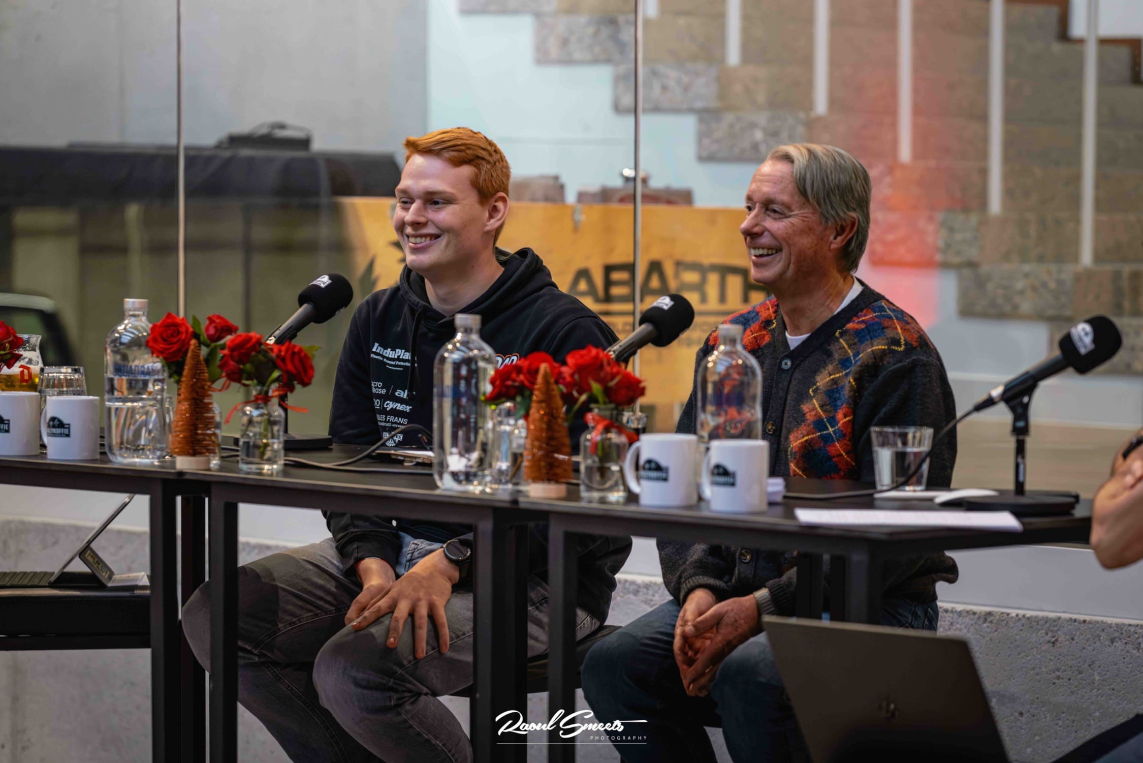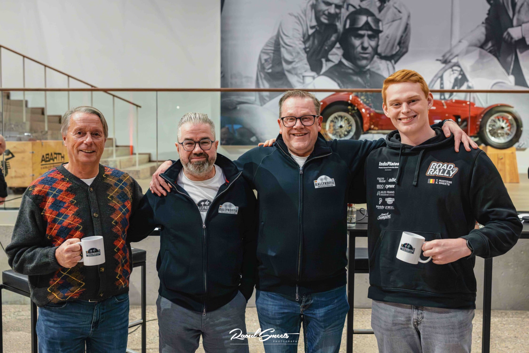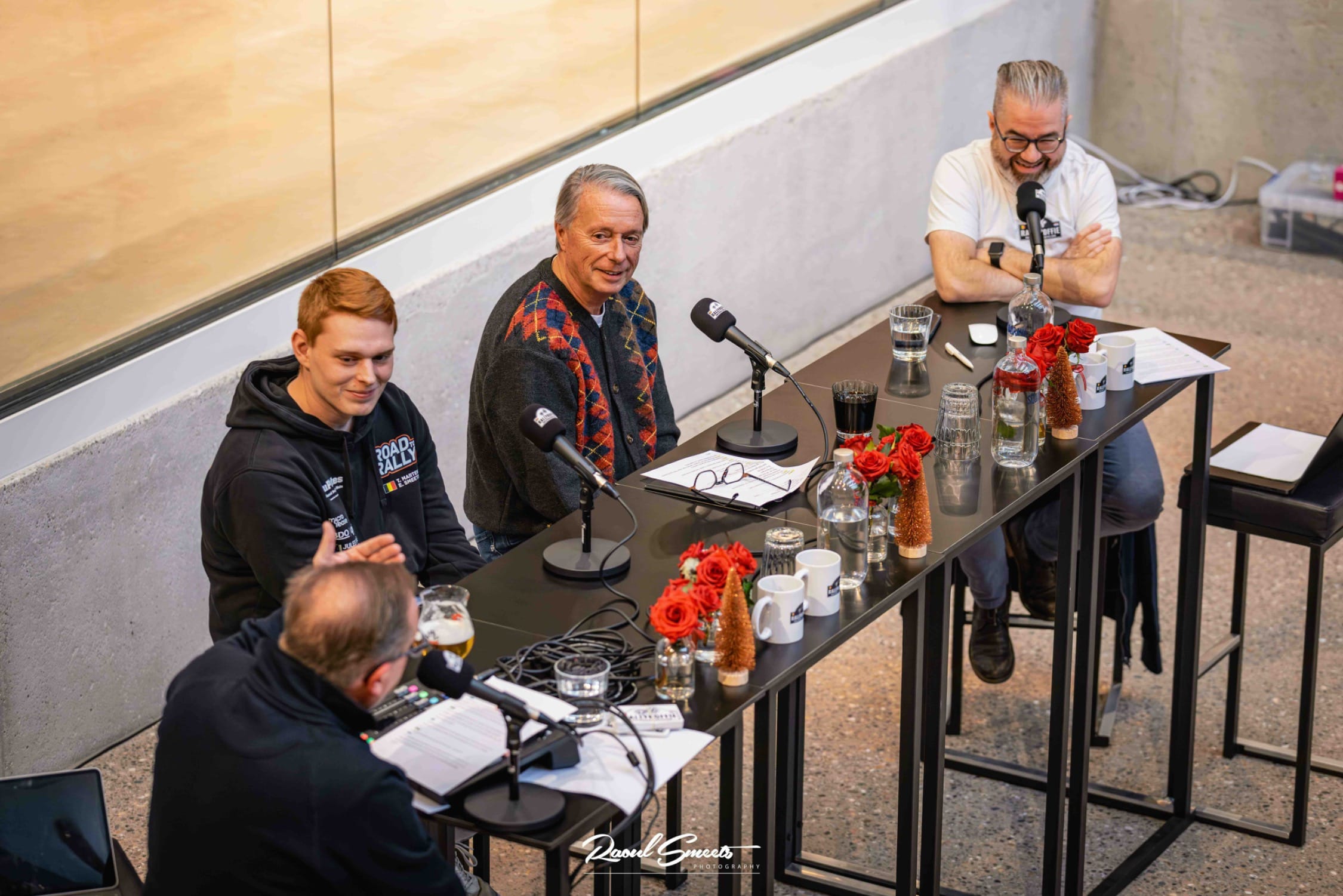 Na de pauze volgde een opmerkelijk contrast. Dirk Van Rompuy en Thomas Martens namen plaats achter de microfoon. 53 jaar leeftijdsverschil, maar één gedeelde passie: rallysport. Van Rompuy bekende geen keuze te kunnen maken tussen de verschillende disciplines van de autosport—“alles heeft zijn charme”—terwijl Martens met frisse blik en ambitie de toekomst vertegenwoordigde. Niet toevallig was hij de jongste gast ooit bij Op de Rallykoffie Podcast.
